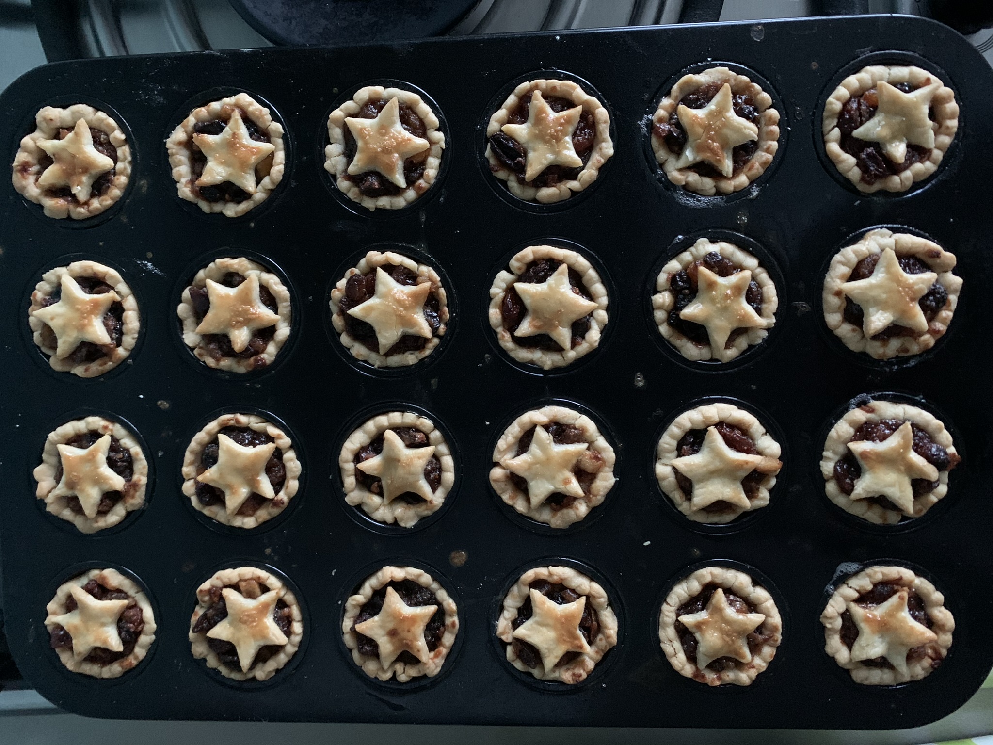Baked mini mince pies still in the tin